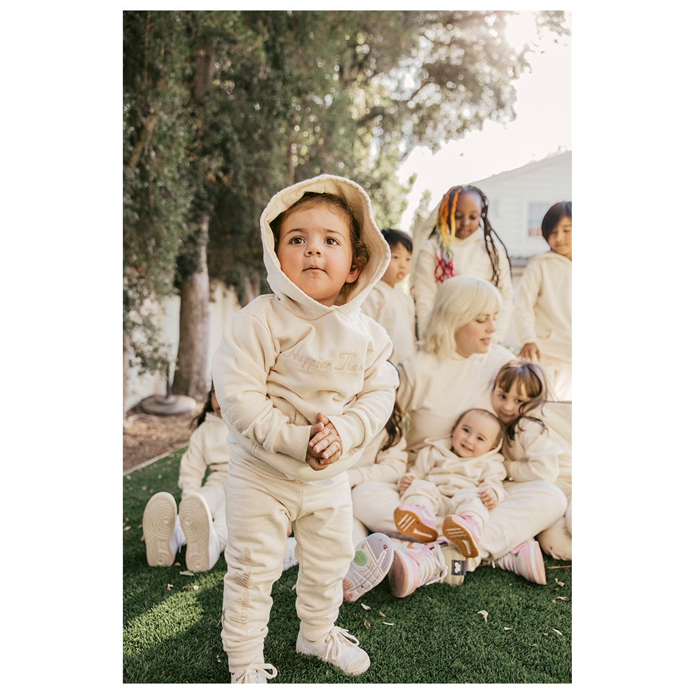 Organic sweat pants with “Happier Than Ever” embroidered on leg.