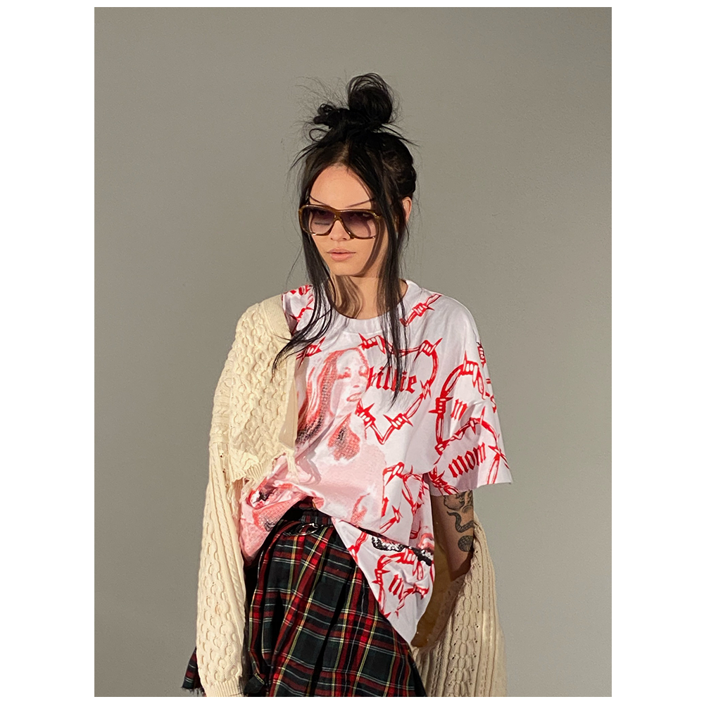 Organic cotton, white t-shirt with ‘mom ❤’ and ‘billie ❤’ printed allover garment. Slightly oversized boxy fit. Made in California.