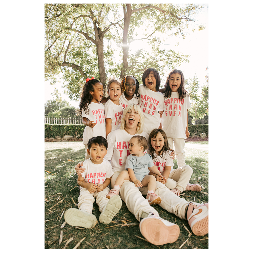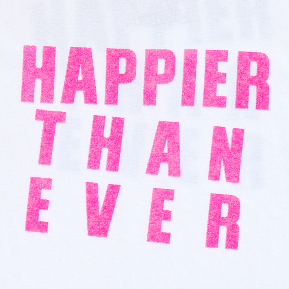 Organic white youth t-shirt with “Happier Than Ever” printed in print on front and backward in black on back.